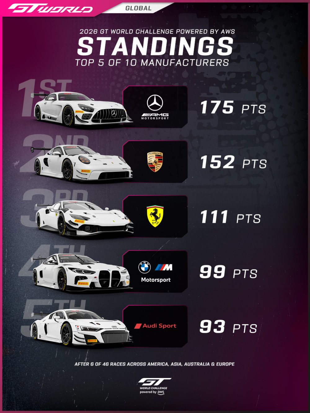 Despite losing the win, Mercedes-AMG is back in familiar territory. The Affalterbach brand leads the global standings on 175 points followed by Porsche (152), Ferrari (111), BMW (99) and Audi (93). McLaren, Aston Martin, Lamborghini, Ford, and Corvette make up the table.